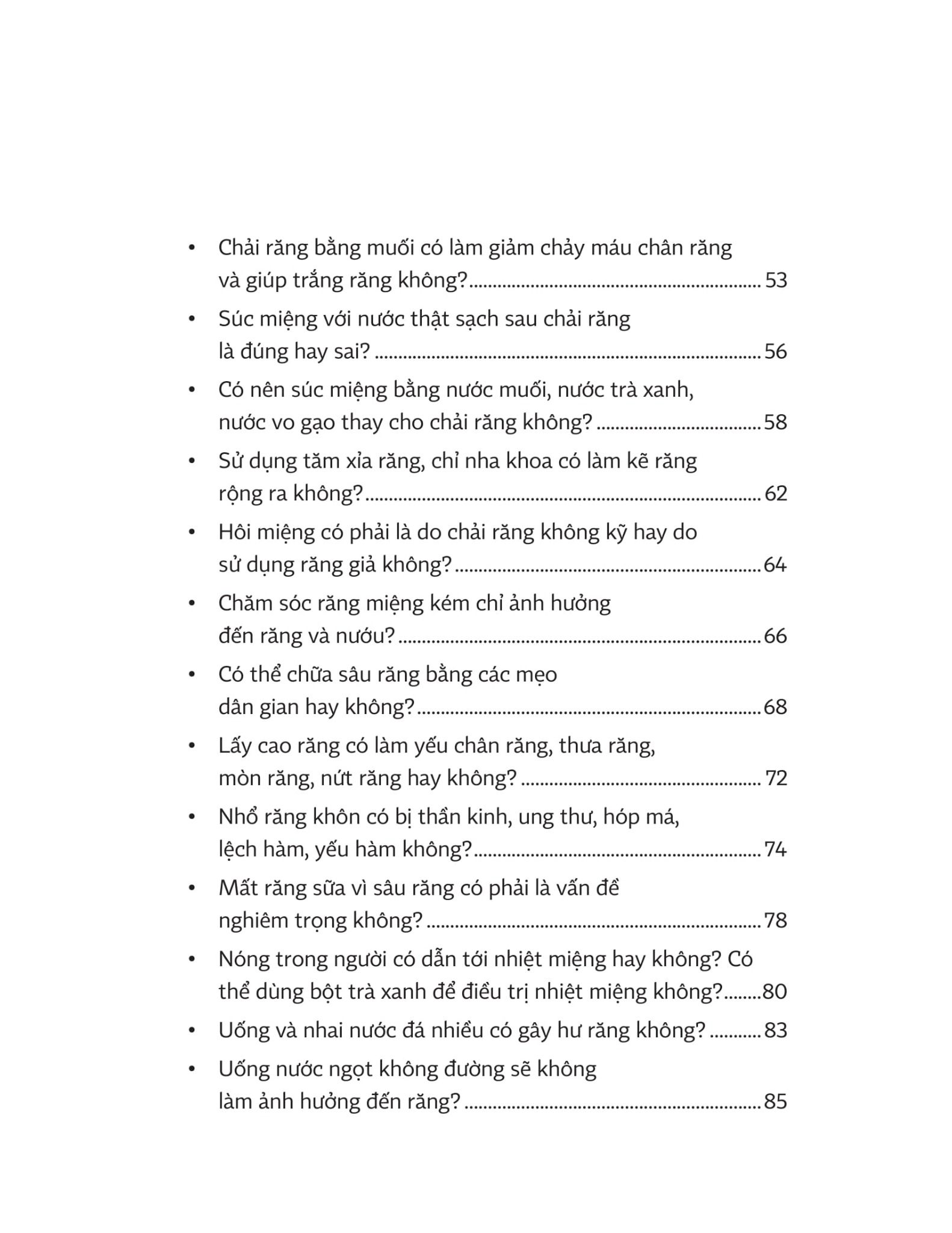Chăm sóc răng miệng là một trong những vấn đề thiết yếu nhưng lại thường bị bỏ qua trong cuộc sống hằng ngày của chúng ta. Không chỉ ảnh hưởng đến sự tự tin trong giao tiếp, sức khỏe răng miệng còn đóng vai trò quan trọng trong sức khỏe tổng quát của mỗi người. Chính vì thế, cuốn sách này không chỉ dừng lại ở việc cung cấp những thông tin cơ bản về vệ sinh răng miệng, mà còn đi sâu vào các vấn đề thường gặp, cách phòng ngừa và điều trị các bệnh lý liên quan đến răng miệng. Đặc biệt, quyển sách này còn đề cập đến các câu hỏi thường gặp và những hiểu lầm phổ biến liên quan đến chăm sóc răng miệng để giúp độc giả có cái nhìn đúng đắn và đầy đủ về vấn đề này.
